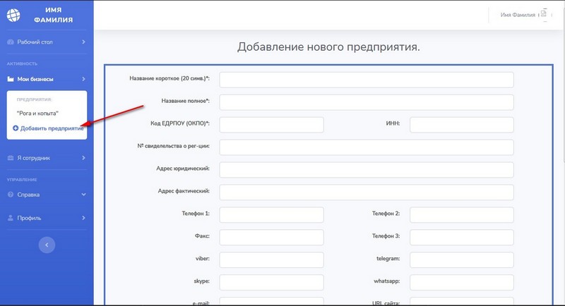 Добавить предприятие мы можем только на самом верхнем уровне Глобального / Основного профиля - синяя тема оформления. Раздел меню "Мои бизнесы" - "Добавить предприятия"