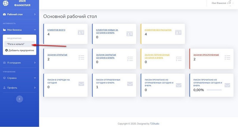 Если мы находимся на самом верхнем уровне("Глобальный" / "Основной" - синяя тема оформления), то попасть в Просмотр / Редактирование карточки "Предприятия" можно в левом меню "Мои бизнесы" - "Название предприятия"