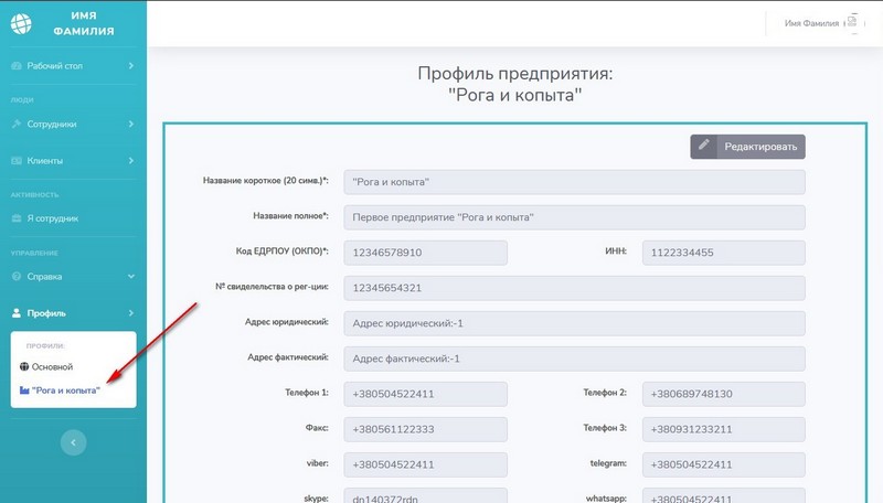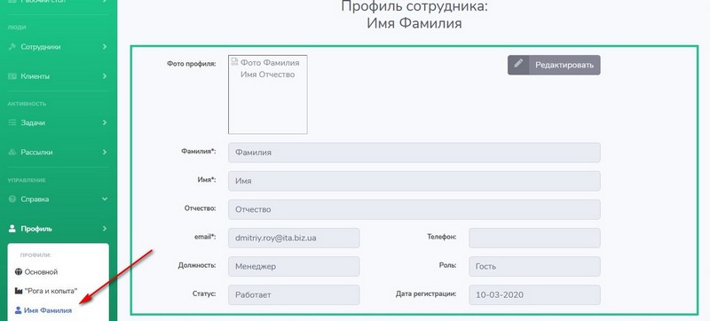 Если мы хотим отредактировать профиль сотрудника в определенном предприятии, то надо на уровне сотрудника (зеленая тема) перейти в левом меню "Профиль" - "Ваше ФИО"