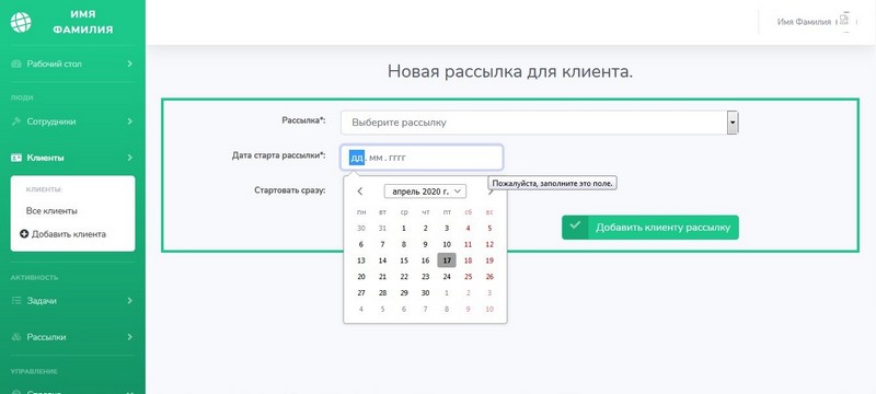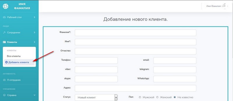 Добавление клиента - левое меню "Клиенты" - "Добавить клиента"