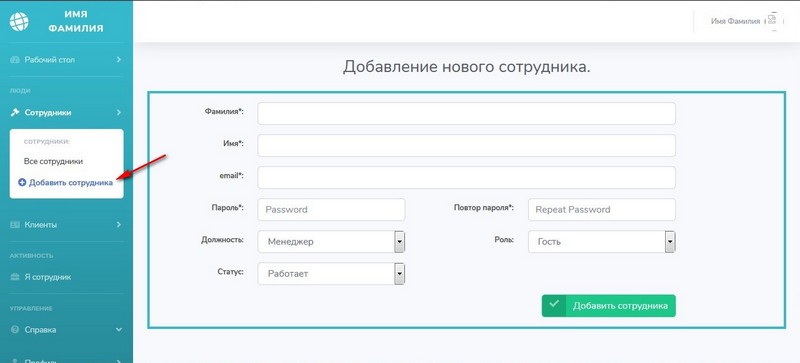 Добавление сотрудника - левое меню "Сотрудники" - "Добавить сотрудника"