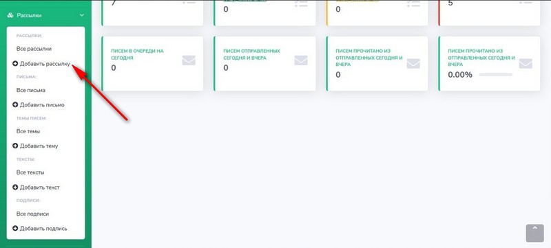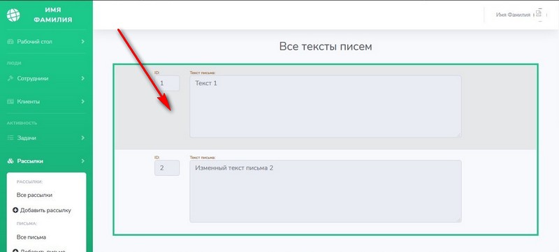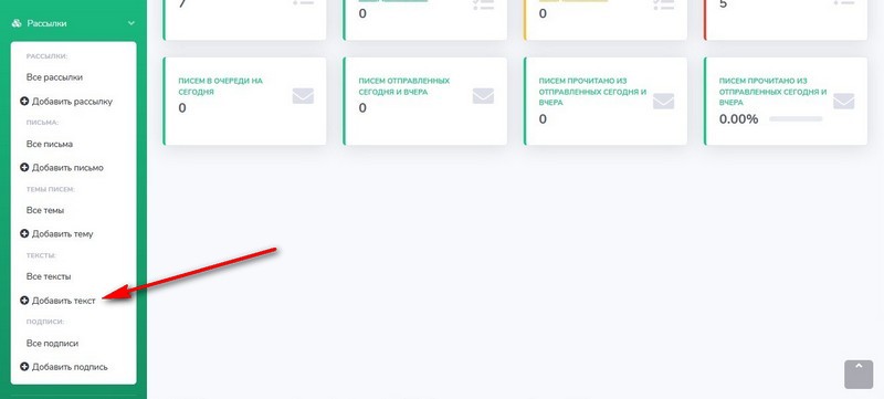 Добавление и просмотр текстов писем доступны в левом меню "Рассылки" в режиме сотрудника (зеленая тема).