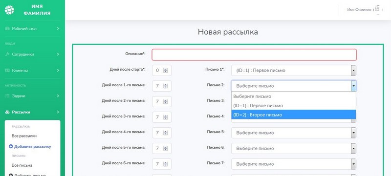 Выбираем подготовленные "Письма" из выпадающего списка (по "Названию письма") и кол-во дней между автоматическими отправками писем.