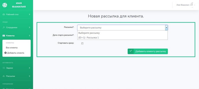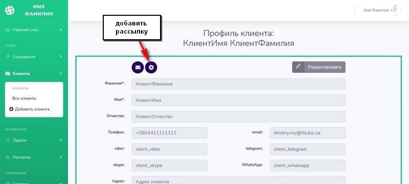 Добавленике "Рассылки" "Клиенту" - доступно в карточке "Клиента" - синяя круглая кнопка с плюсиком.