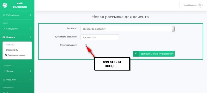 Выбираем подготовленную "Рассылку" из выпадающего списка (по "Названию рассылки") и "Дату старта". Если проставим чекбокс "Отправить сразу", то первое письмо отправится сегодня в течение часа (9:00 - 18:00). Если время установки рассылки после 18:00, то первое письмо будет отправлено на следующий день.