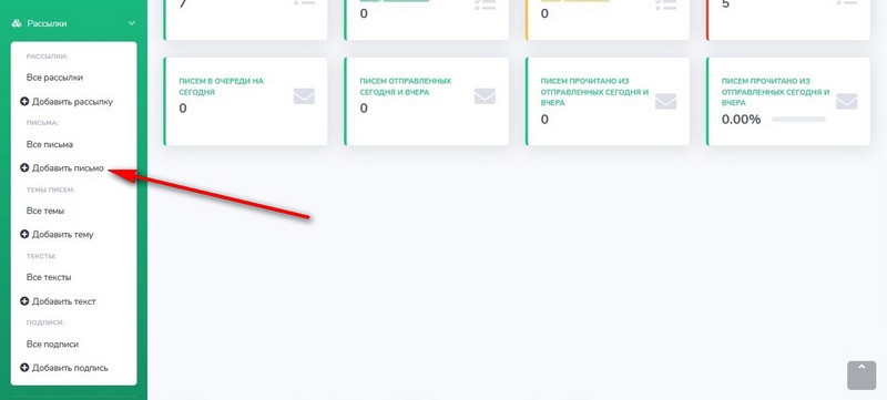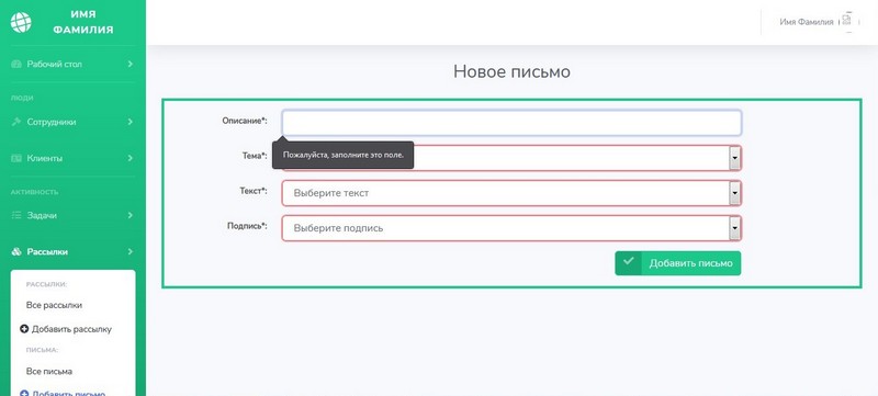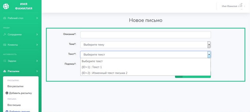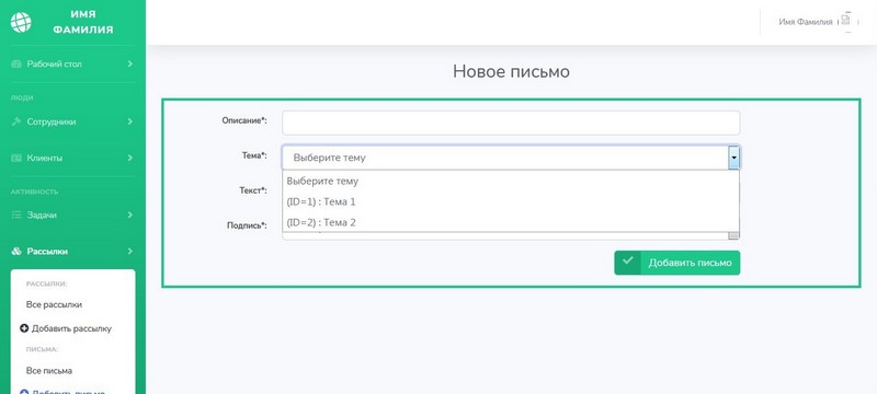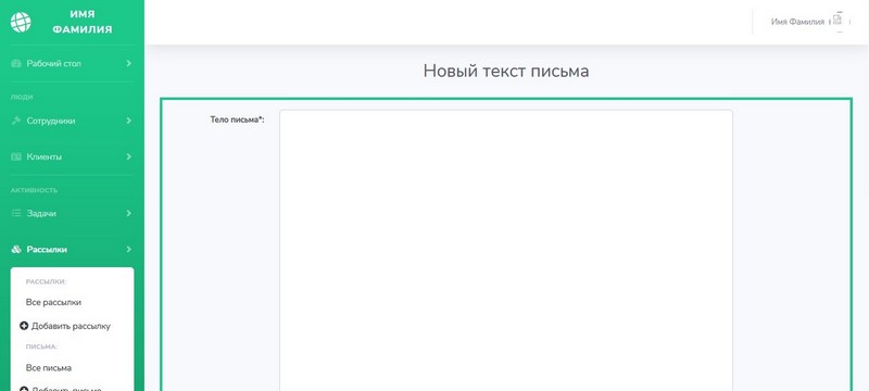 Создание "Письма" - доступно в левом меню "Рассылки" в режиме сотрудника (зеленая тема).