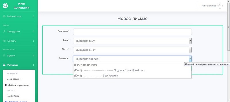 Выбираем подготовленные "Тему", "Текст" и "Подпись", а также указываем Название этого письма (это будет необходимо для создания рассылки и в последующем видеть какие письма клиенту отправлены...)