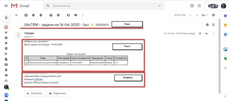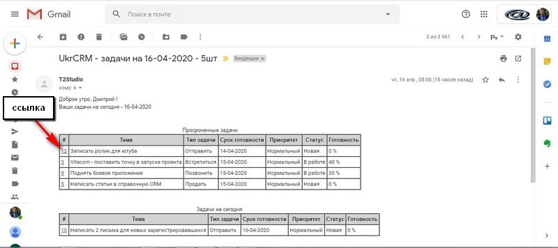Если у сотрудника есть на сегодня текущие и просроченные задачи, то он утром получает в почту (указанную в его профиле) список этих задач, что очень удобно. В этом списке есть описание задачи, а также ссылка для быстрого входа в UkrCRM для работы с этой задачей.