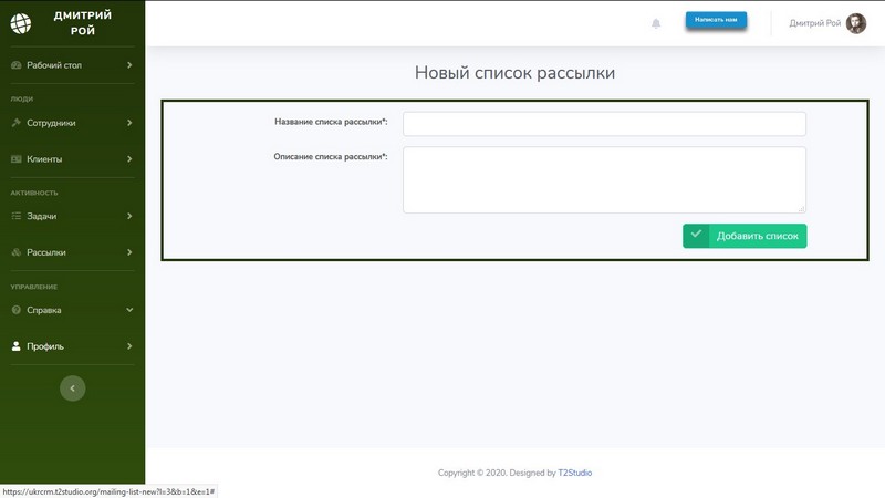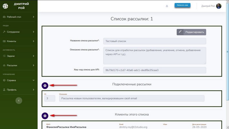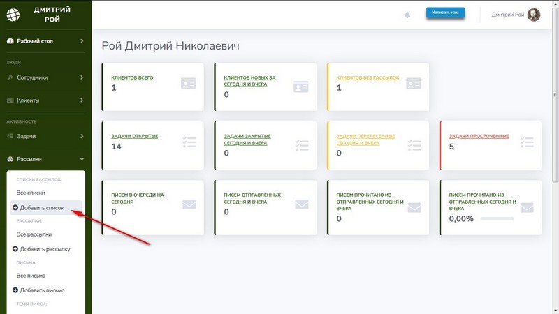 Для отбора клиентов под какую-то стратегию продажи (рассылку) можно делать определенные Списки. Добавление нового Списка доступно в левом меню "Рассылки" в режиме сотрудника (зеленая тема).