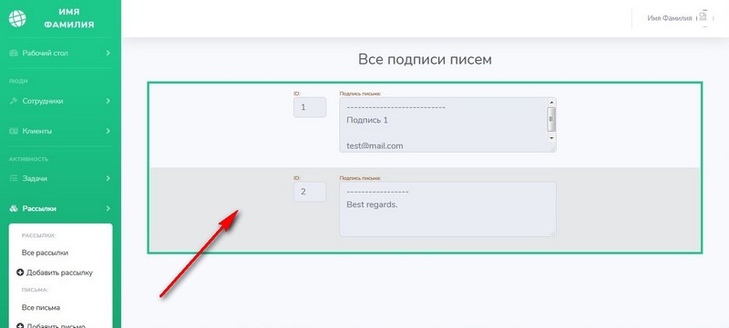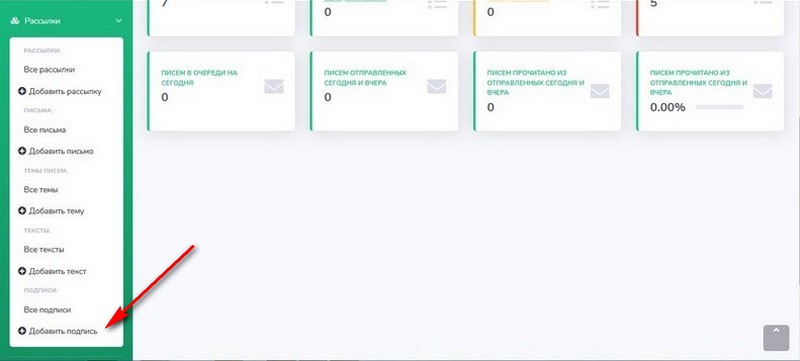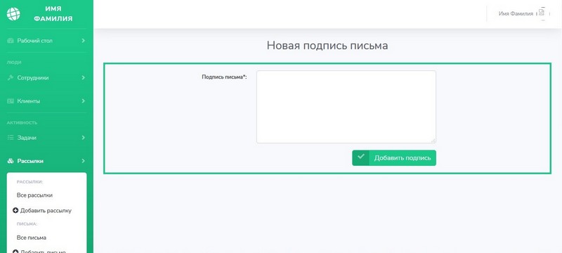 Добавление и просмотр подписей писем доступны в левом меню "Рассылки" в режиме сотрудника (зеленая тема).