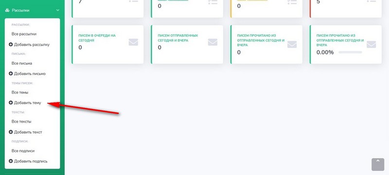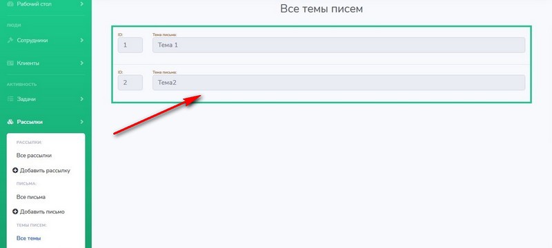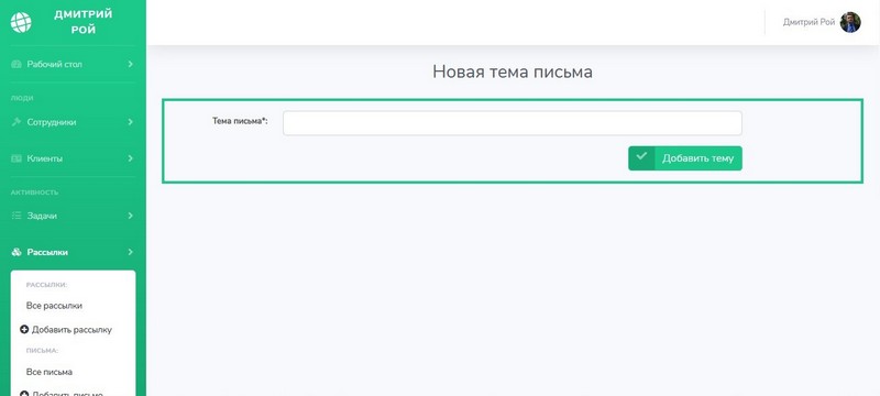 Добавление и просмотр тем писем доступны в левом меню "Рассылки" в режиме сотрудника (зеленая тема).