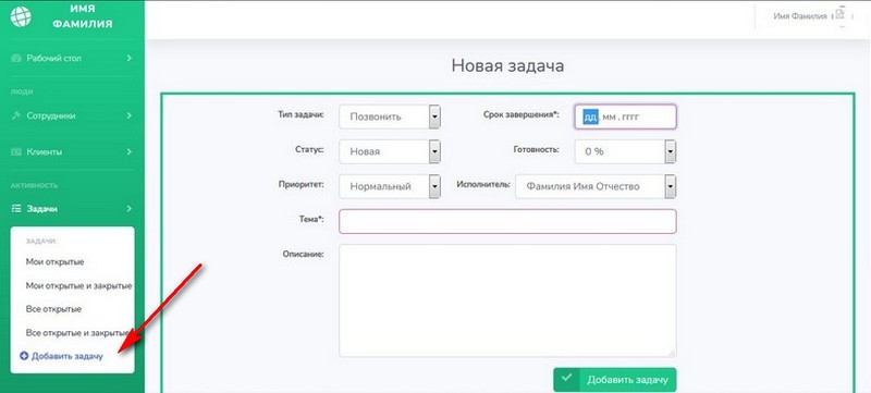 Добавление и просмотр задач доступны в левом меню "Задачи".