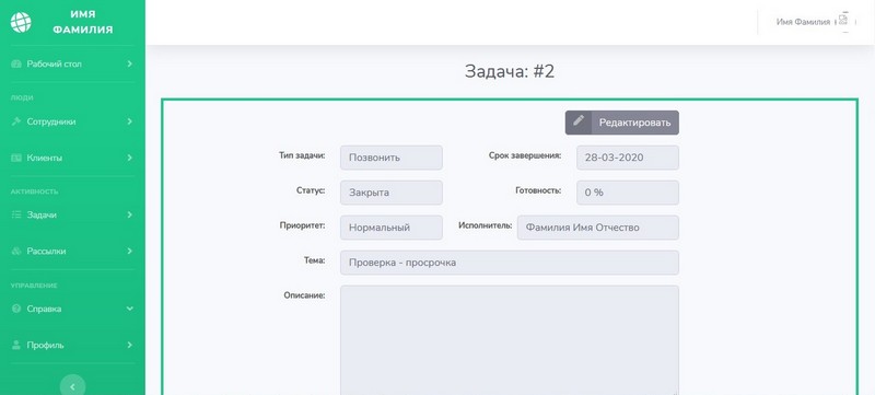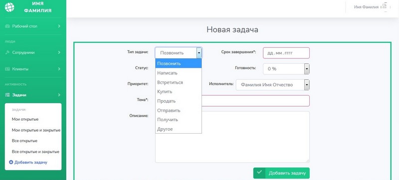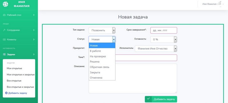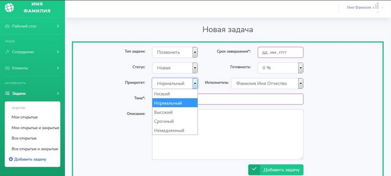Каждая задача должна иметь "Срок выполнения" и "Тему" (обязательные поля отмечены звёздочкой *). Исполнителем по умолчанию ставится текущий пользователь. Поэтому, если надо назначить другого исполнителя, то просто выберите из выпадающего списка. В выпадающем списке отображаются сотрудники во всех статусах, кроме "Уволен".